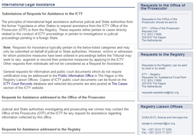La page contient les instructions à suivre pour adresser une demande d’assistance au Bureau du Procureur, au Greffe ou aux autorités compétentes du pays hôte (les Pays-Bas) concernant un certain nombre de questions, telles que la réception de documents judiciaires du Tribunal ou le recueil des déclarations de l’un de ses accusés. Les victimes et les témoins peuvent également consulter cette page afin de s’assurer des démarches à entreprendre pour demander la modification des mesures de protection les concernant.